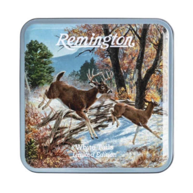 • Présentation soignée : Boîte métallique collector arborant une œuvre d'art vintage authentique de la collection Remington